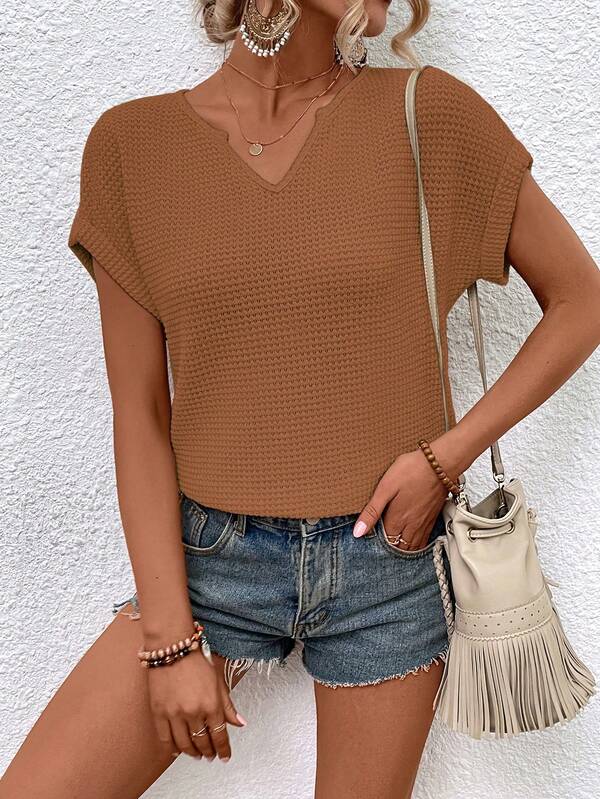 SHEIN LUNE Notched Neck Batwing Sleeve Waffle Knit Tee