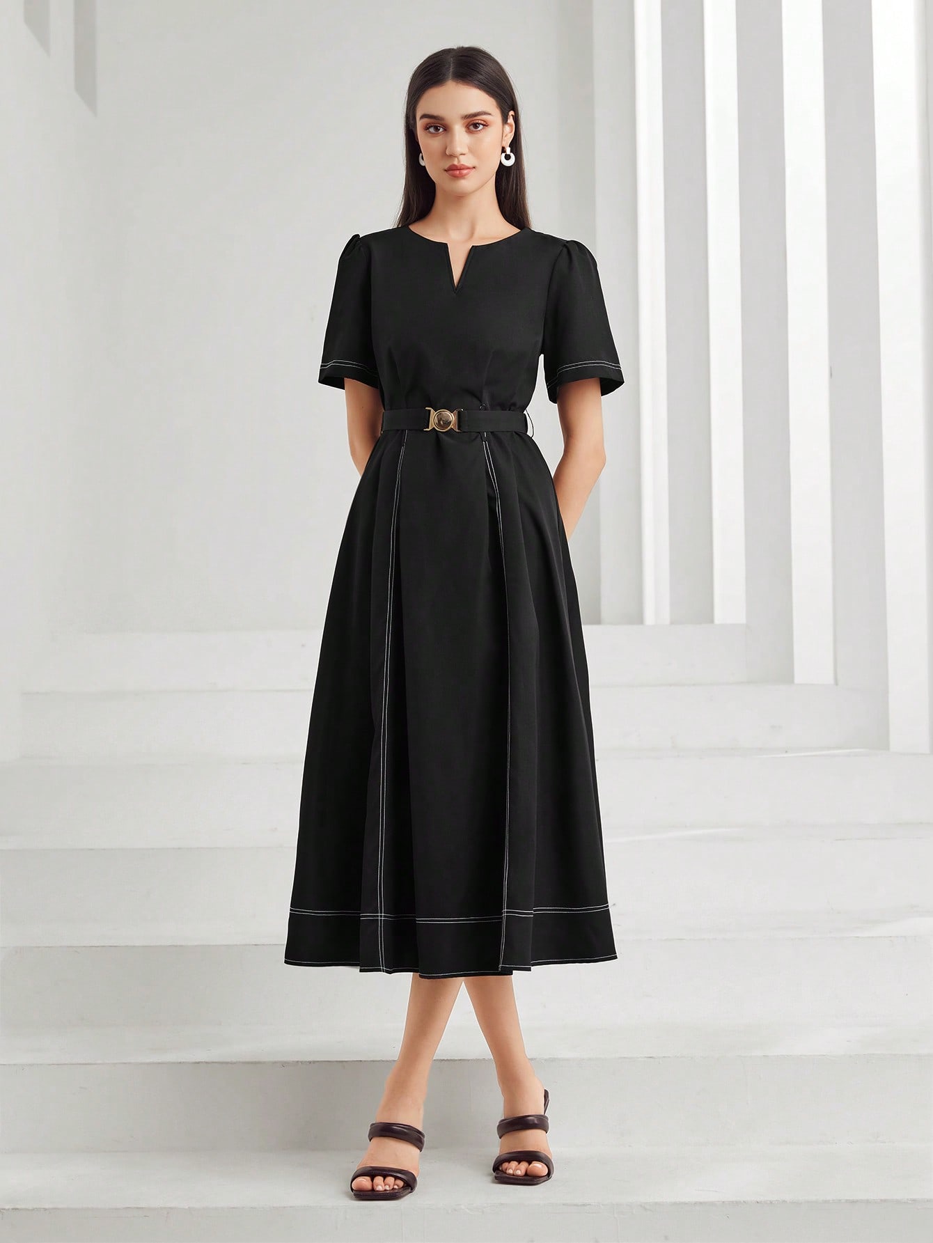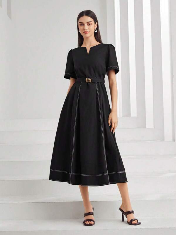 SHEIN Mulvari Notched Neck Contrast Stitch Belted Dress