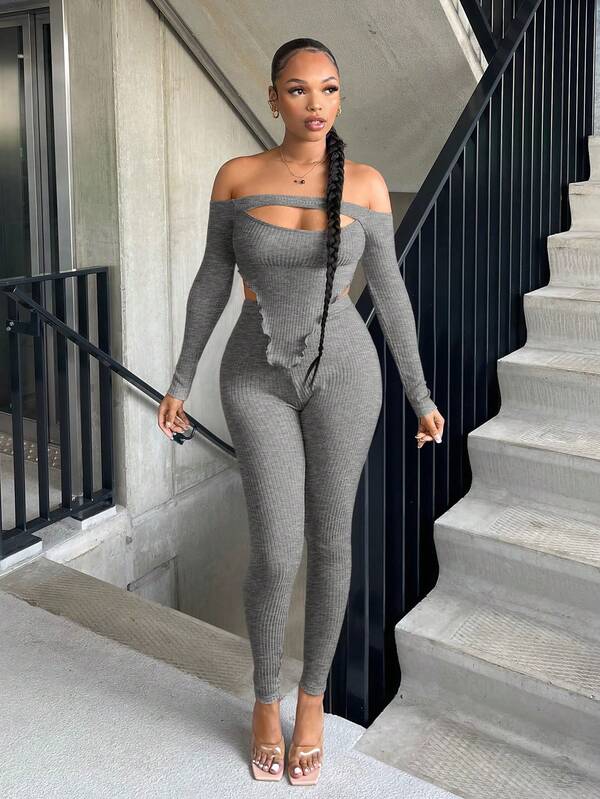 SHEIN SXY Off Shoulder Asymmetrical Hem Crop Top & Leggings