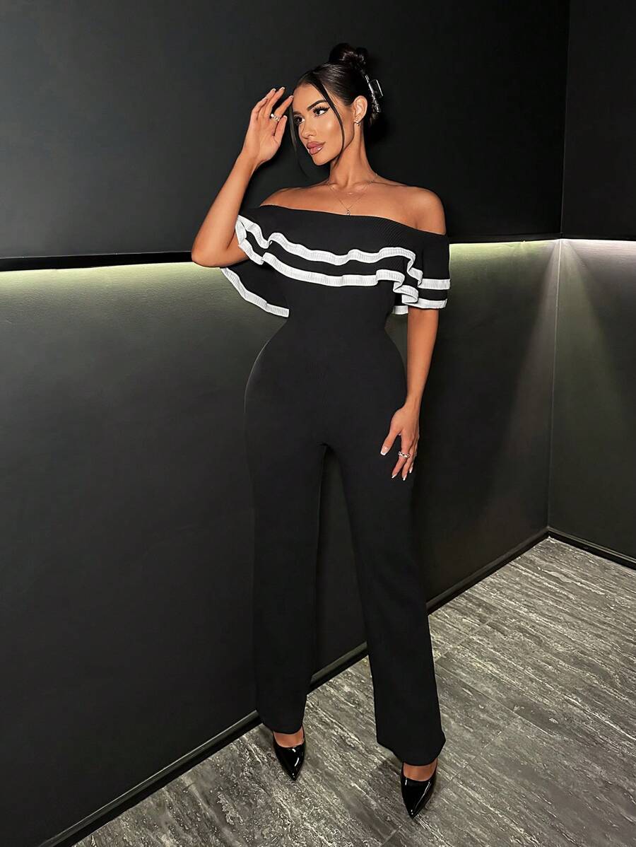 SHEIN SXY Off Shoulder Contrast Piping Ruffle Trim Jumpsuit