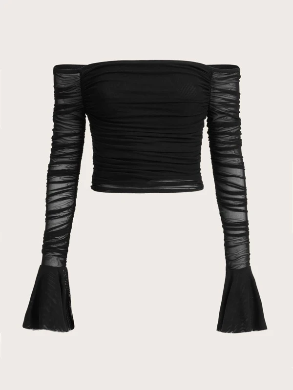SHEIN ICON Off Shoulder Flounce Sleeve Ruched Mesh Crop Top