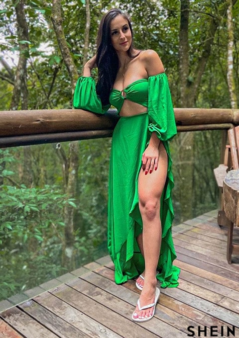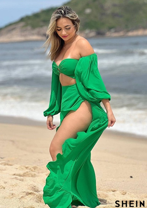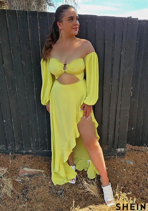 SHEIN SXY Off Shoulder Lantern Sleeve Cut Out O-ring Detail Asymmetrical Hem Dress