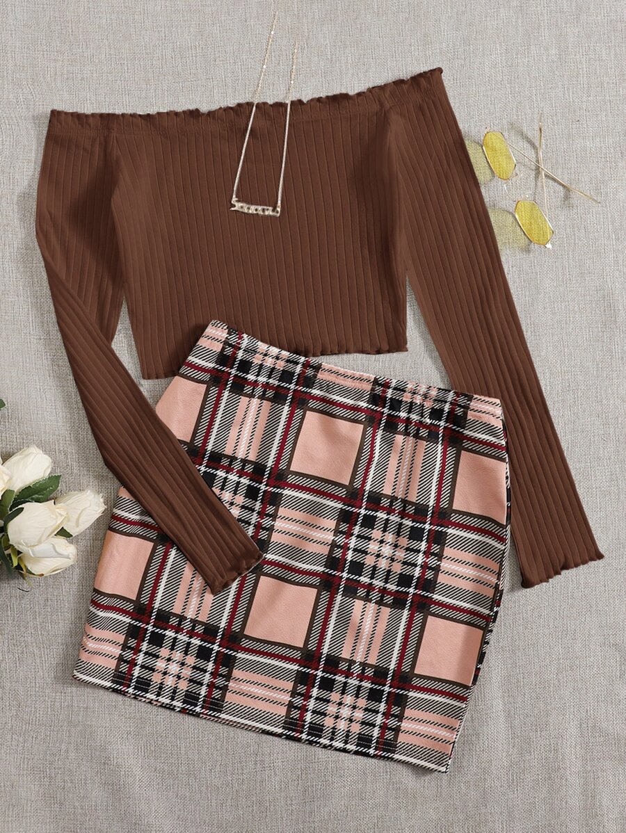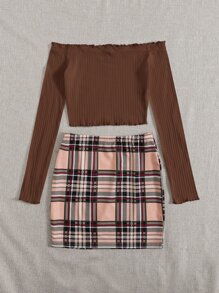SHEIN Privé Off Shoulder Lettuce Edge Tee and Tartan Skirt Set