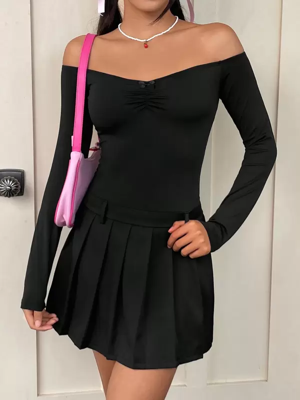 SHEIN Qutie Off Shoulder Ruched Front Pleated Hem Dress