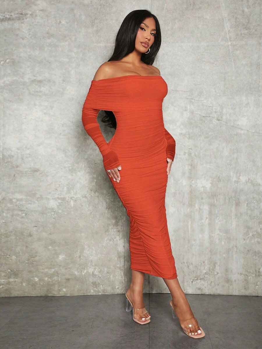 SHEIN SXY Off Shoulder Ruched Mesh Bodycon Dress
