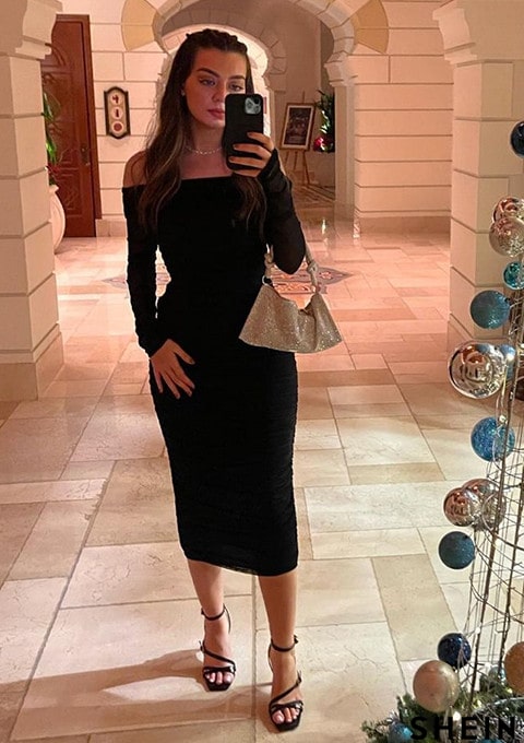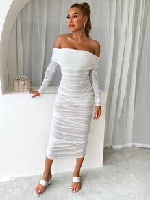 Joyfunear Off Shoulder Ruched Mesh Bodycon Dress