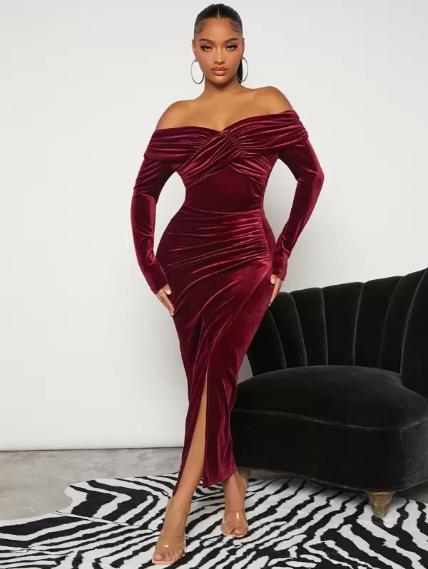 SHEIN SXY Off Shoulder Ruched Split Thigh Velvet Dress