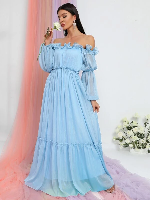 Off Shoulder Ruffle Trim Ruffle Hem Chiffon Dress