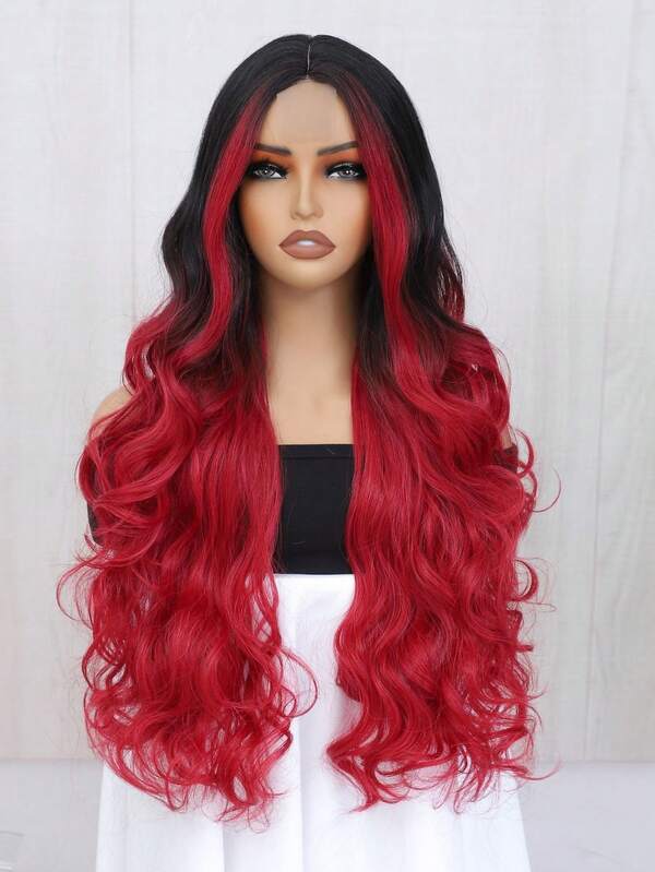 Ombre Burgundy Highlight Long Wave Wigs Black To Red Body Wave Synthetic Wig For Woman 28 Inch Daily Use Hair