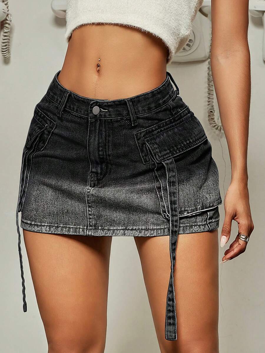 Ombre Flap Pocket Buckle Detail Denim Skirt