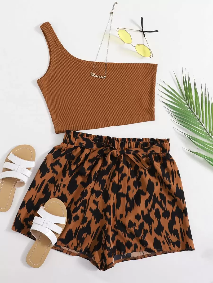 SHEIN VCAY One Shoulder Top & Graphic Print Belted Two Piece Set