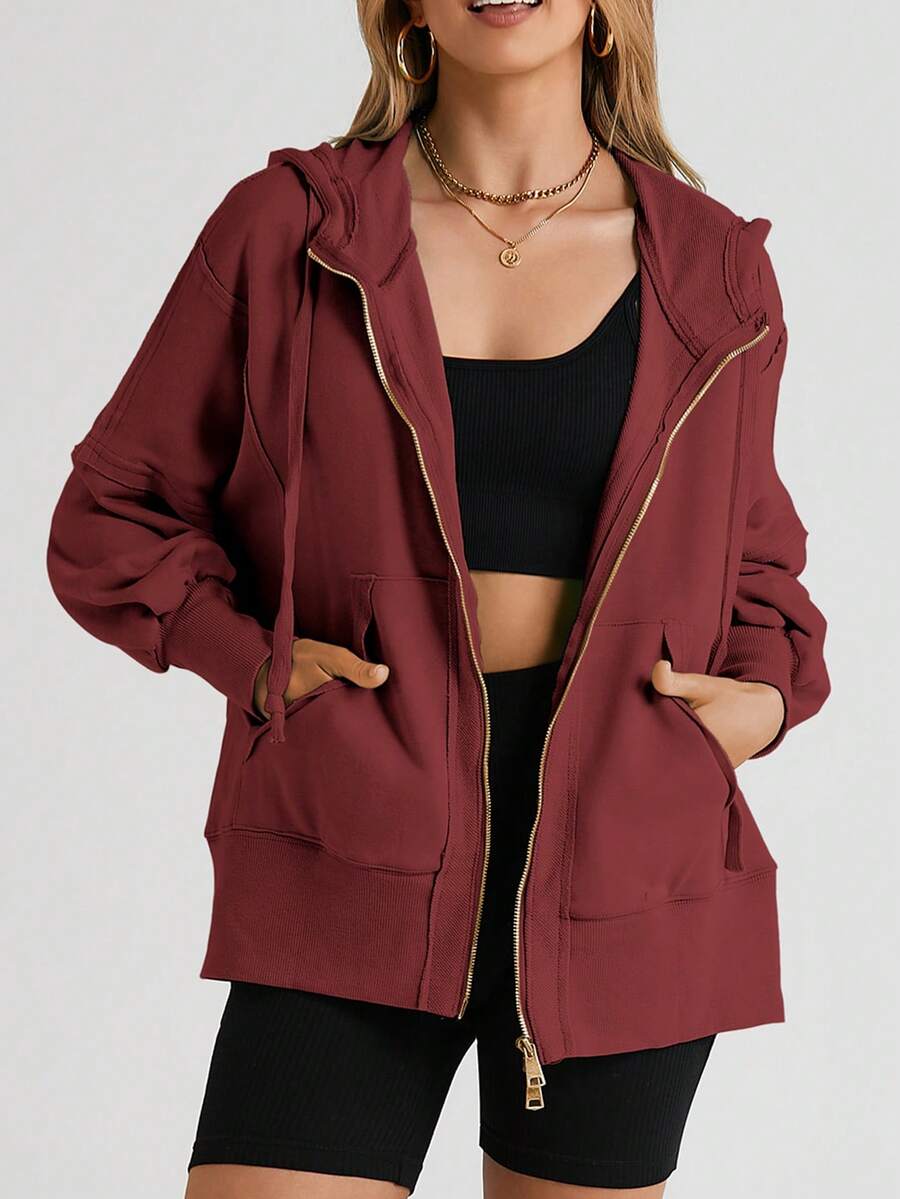 Astylish Oversized Brown Raw Edge Exposed Seam Full Zip Hoodie