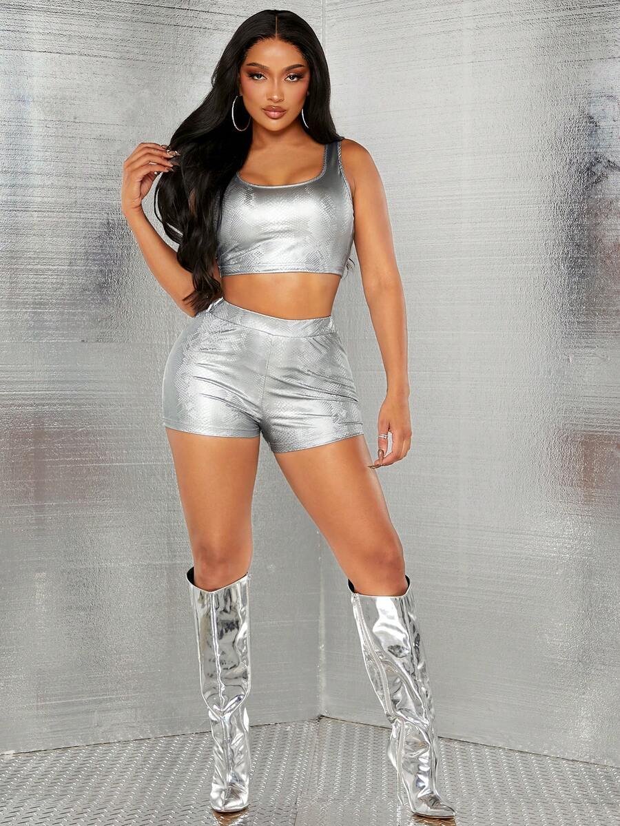 SHEIN SXY Party & Nightclub Gorgeous Snake Pattern Metallic Silver Pu Vest And Shorts Set