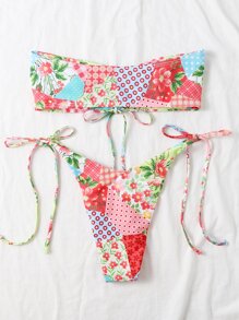 SHEIN Swim Mod Patchwork Print Bikini Set Tie Front Bandeau Top & Thong Bottom 2 Piece Bathing Suit