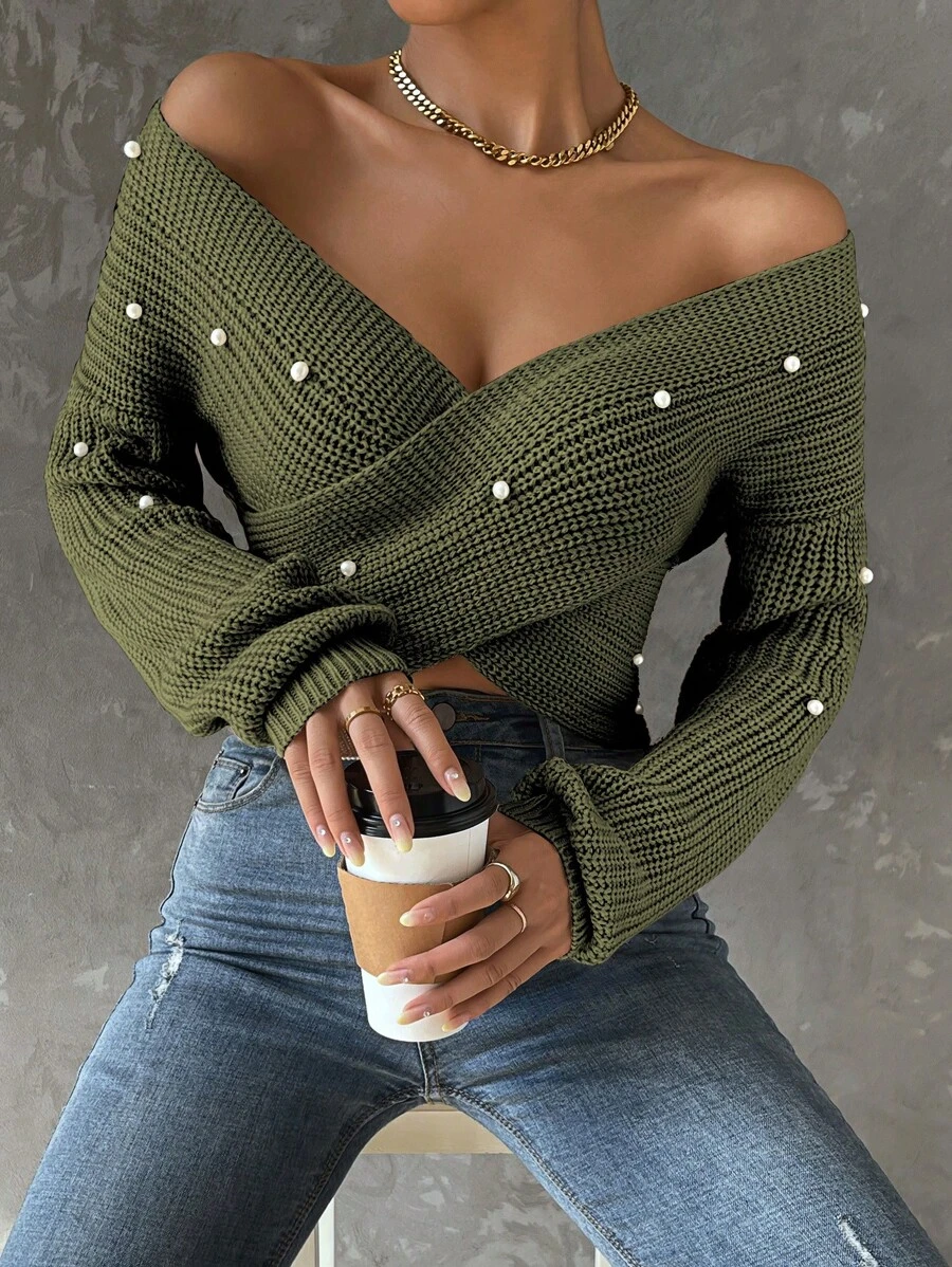 SHEIN Privé Pearls Beaded Crossover Drop Shoulder Crossover Sweater