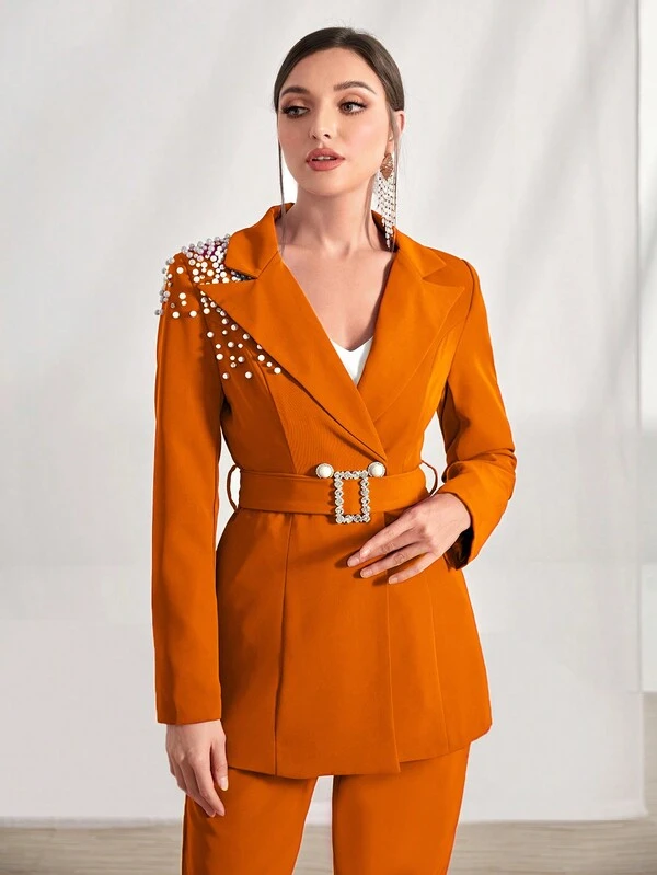SHEIN Modely Pearls Beaded Rhinestone Detail Belted Blazer