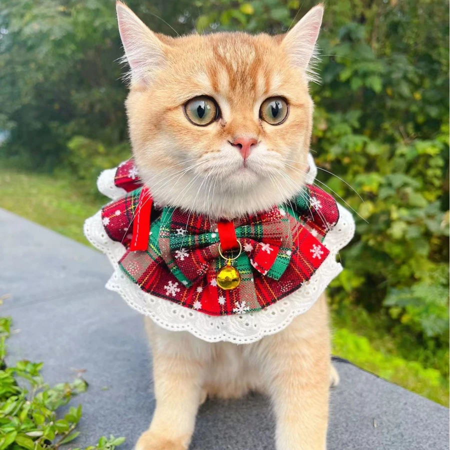 Pet Bandana, Red & Green Plaid Bow Tie Design Cat Bib With Lace, Suitable For Kittens And Puppies