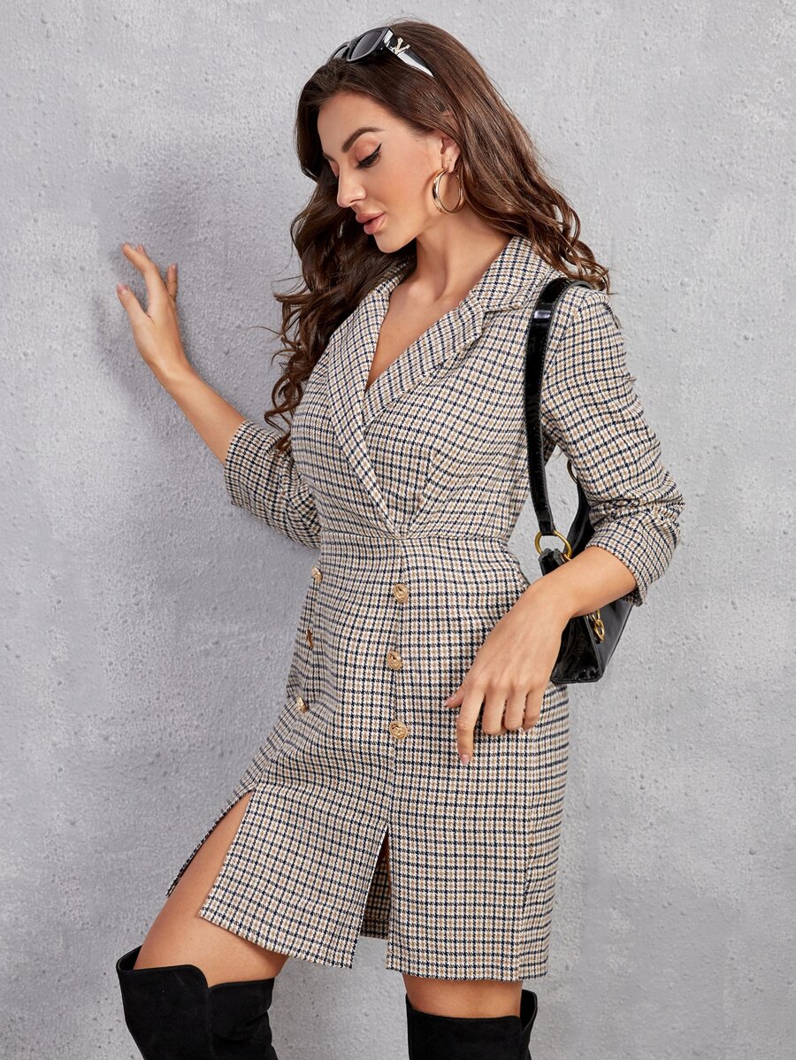SHEIN Plaid Lapel Collar Split Hem Fake Button Wool-Mix Dress