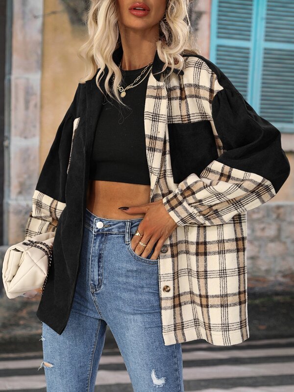 SHEIN LUNE Plaid Patched Pocket Drop Shoulder Corduroy Coat