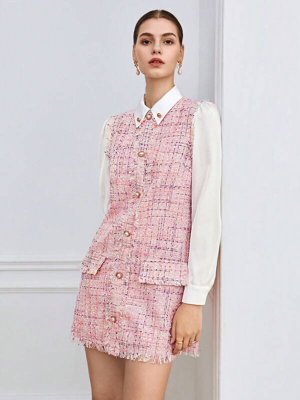 SHEIN BIZwear Plaid Pattern Raw Trim Button Front Tweed Dress Without Blouse
