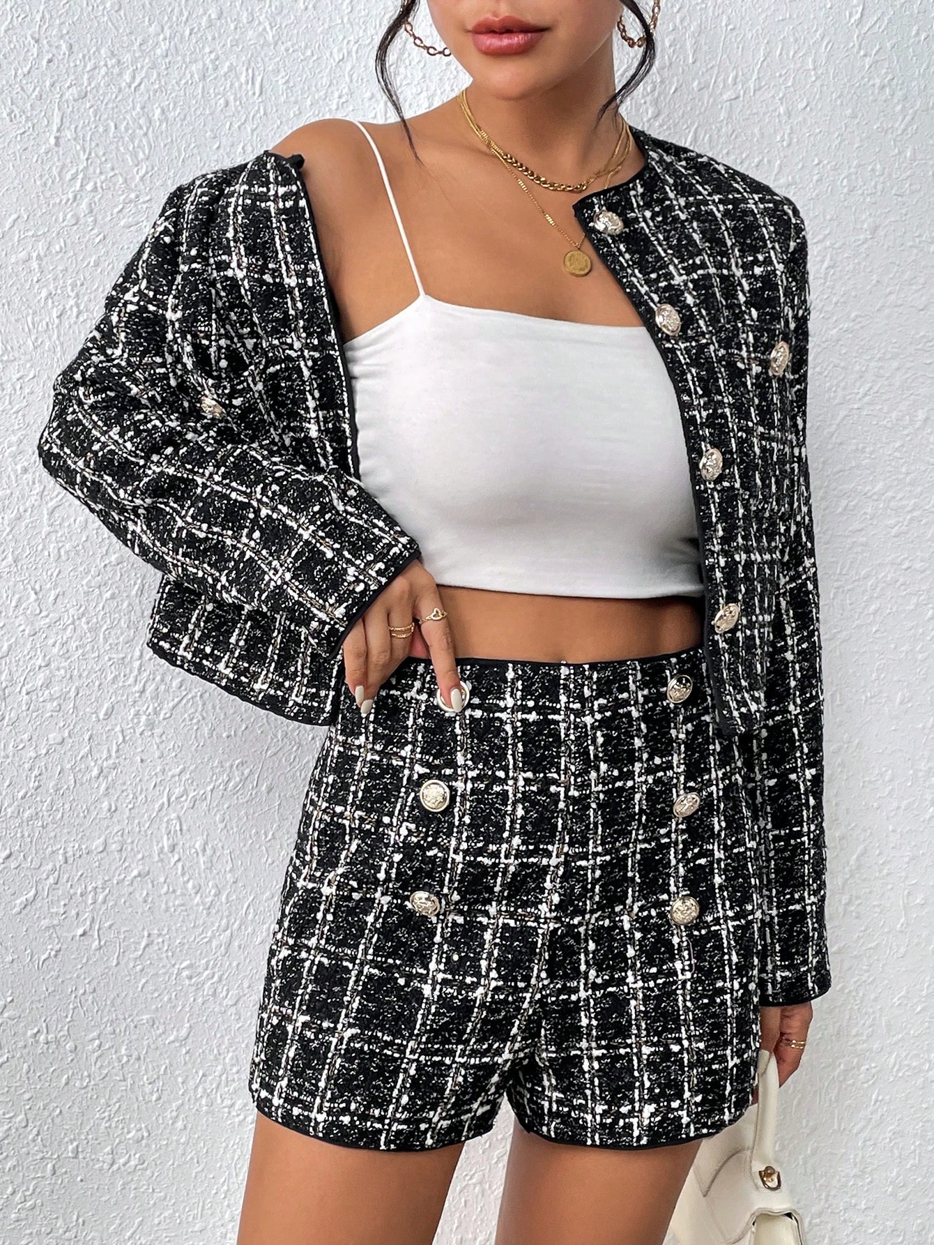 SHEIN Unity Plaid Print Button Front Jacket & Shorts