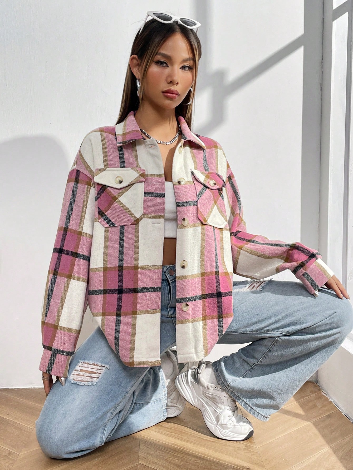 Plaid Print Flap Pocket Drop Shoulder Blouse