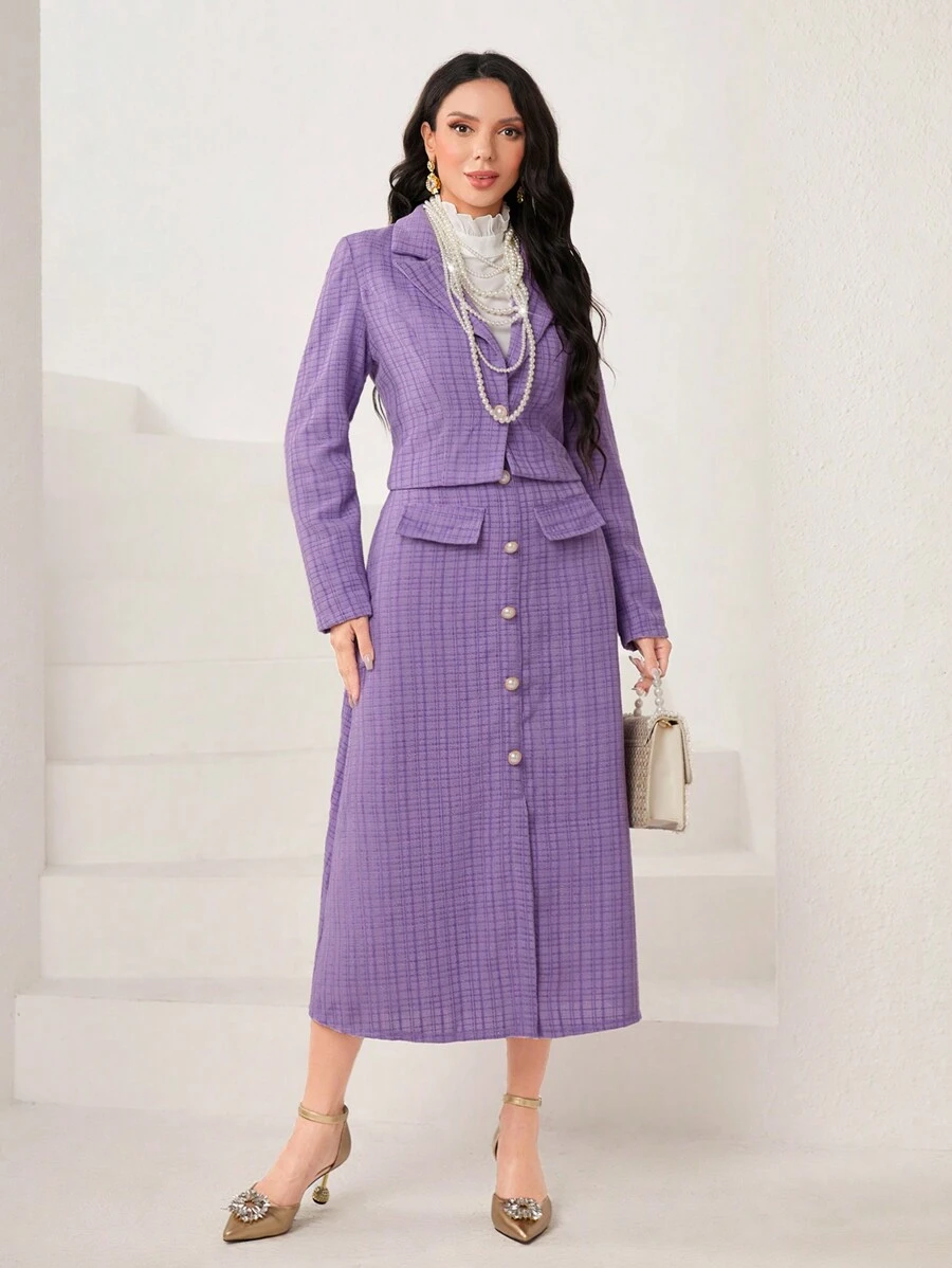 SHEIN Modely Plaid Print Lapel Neck Blazer & Button Front Skirt