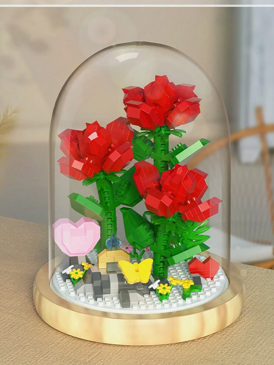 Plant And Flower Series With Dustproof Cover Base Micro-Particle Diy Miniature Building Block Flower Ornaments Rose Bouquet Bonsai For Women, Valentines Gifts