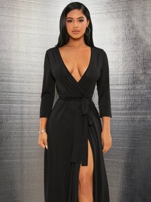 SHEIN SXY Plunging Neck Belted Split Thigh Dress