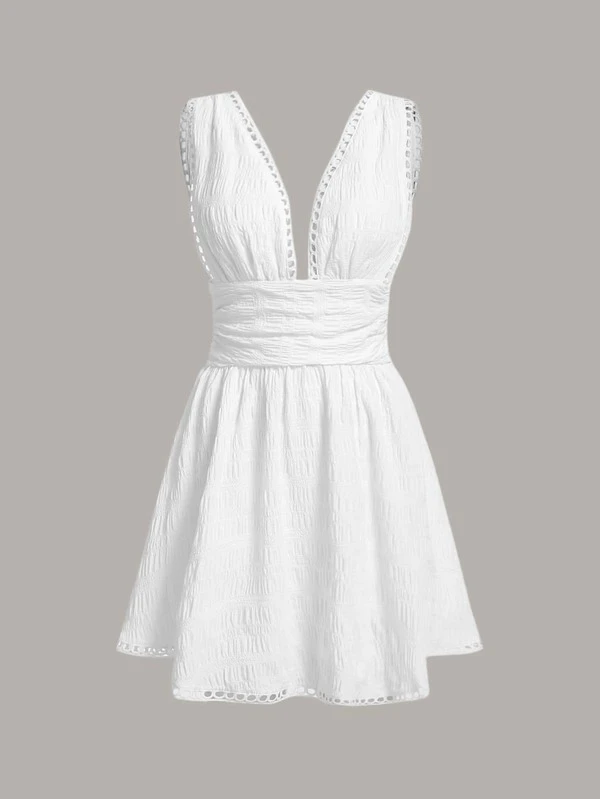 SHEIN WYWH Plunging Neck Lace Trim Ruched Waist Dress
