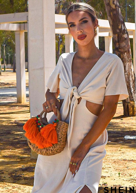 SHEIN VCAY Plunging Neck Tie Front Cut Out Waist Split Thigh Dress