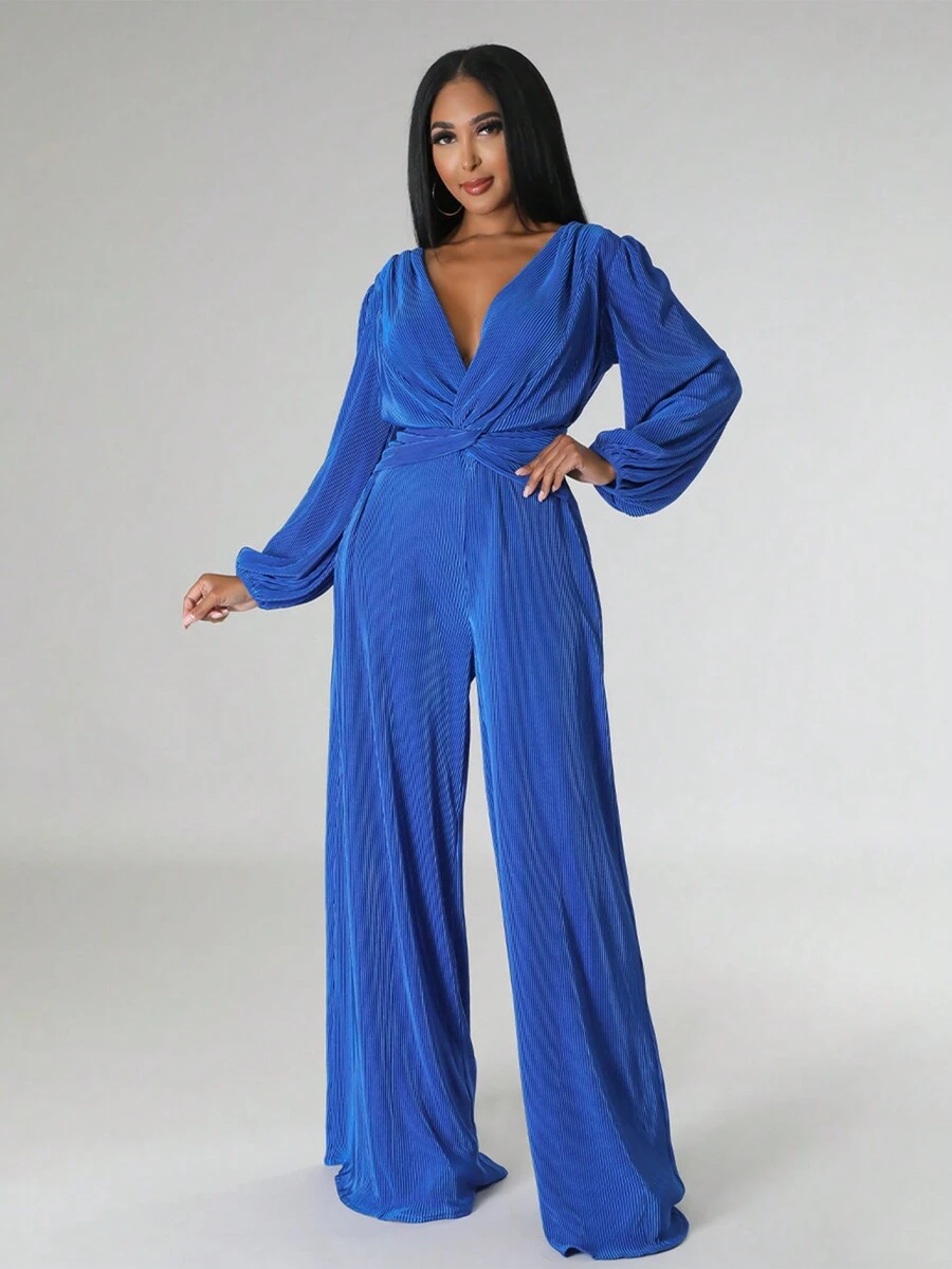 Plunging Neck Twist Front Wide Leg Jumpsuit