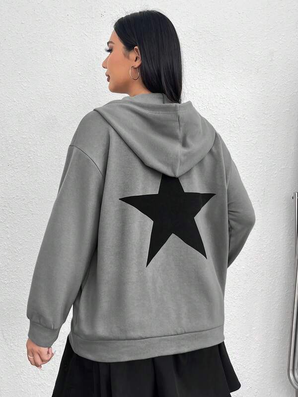 SHEIN EZwear Plus 1pc Letter Graphic Zip Up Drop Shoulder Drawstring Hoodie