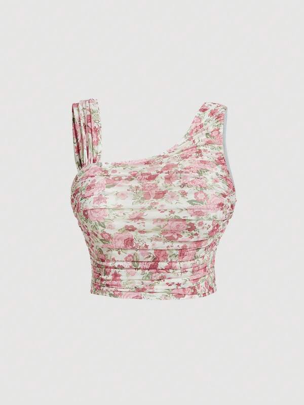 SHEIN MOD Plus Allover Floral Print Asymmetrical Neck Ruched Crop Top