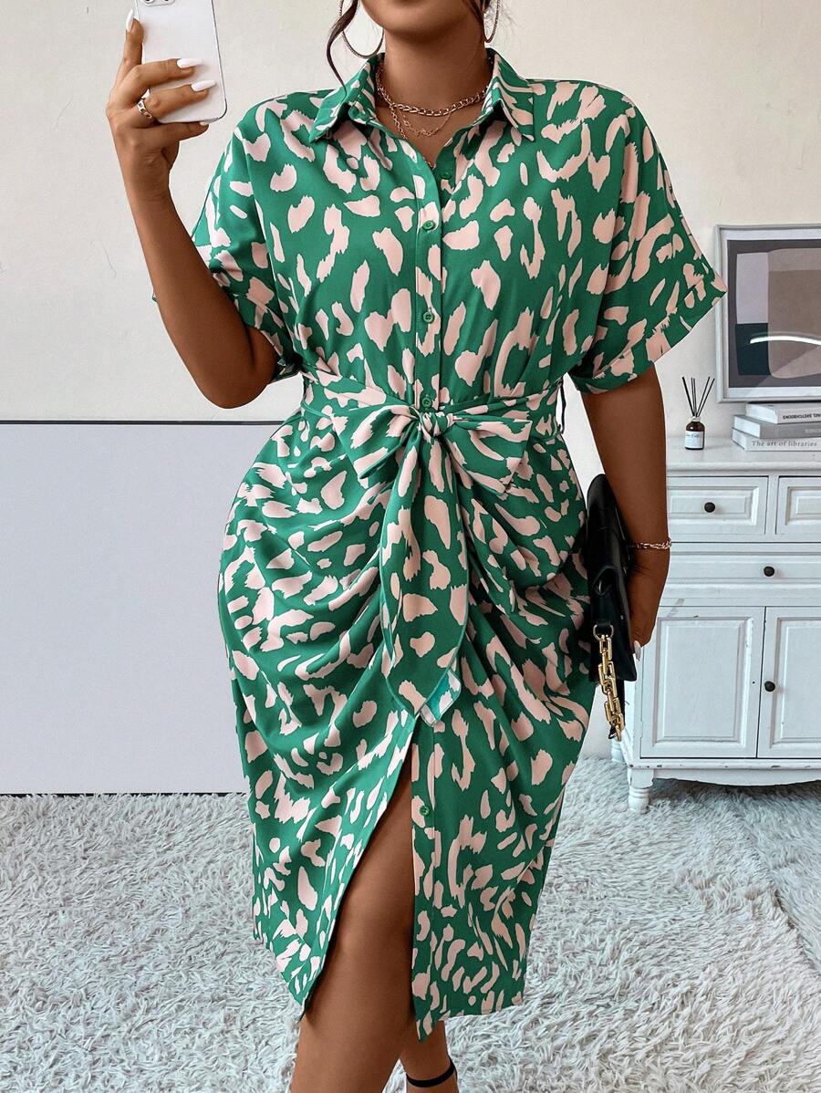 SHEIN Privé Plus Allover Print Batwing Sleeve Ruched Belted Shirt Dress