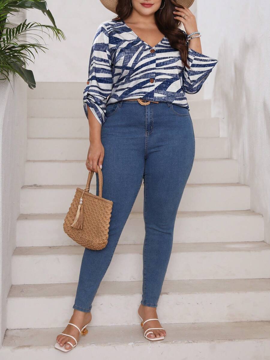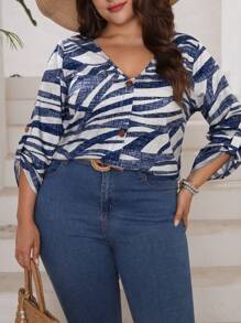 SHEIN LUNE Plus Allover Print Button Front Blouse