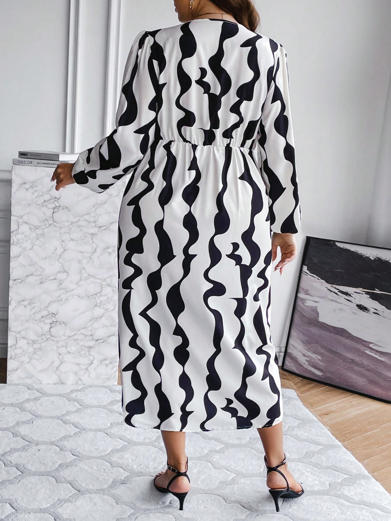 SHEIN Frenchy Plus Allover Print Lantern Sleeve Wrap Hem Dress