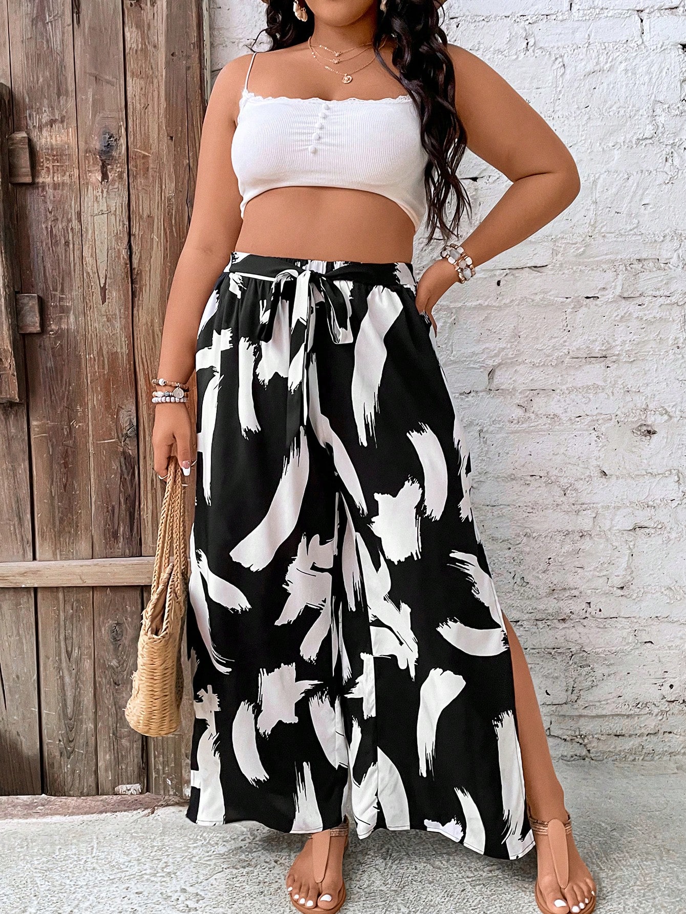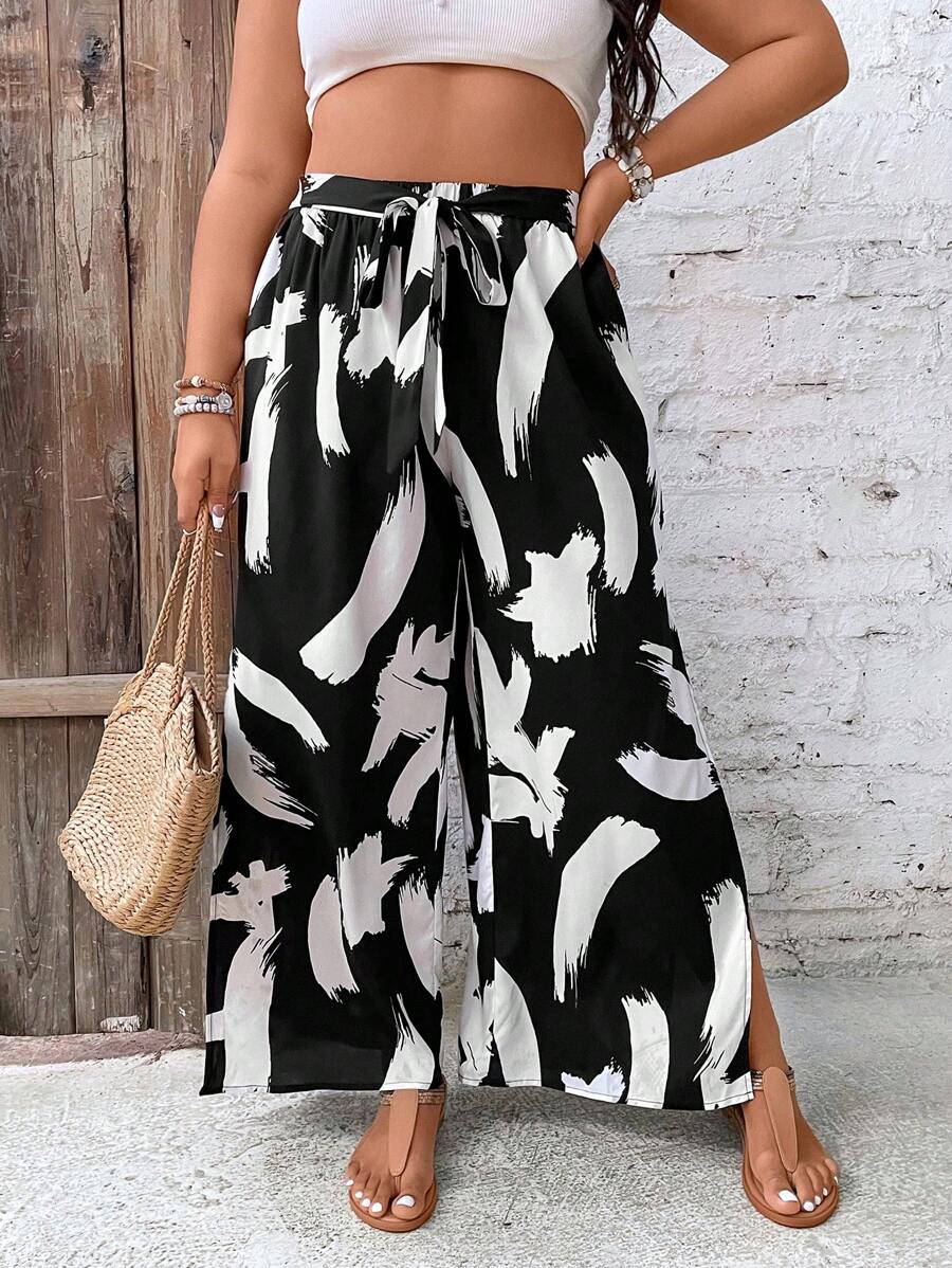 SHEIN LUNE Plus Brush Print Split Hem Belted Wide Leg Pants
