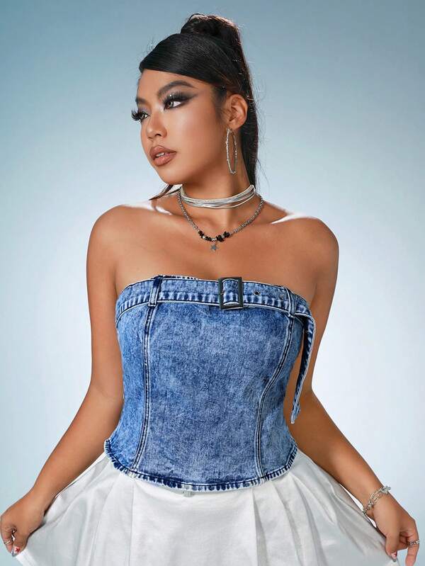 SHEIN ICON Plus Buckle Detail Tube Denim Top