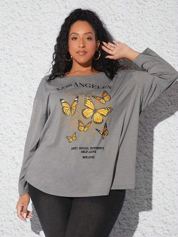 SHEIN CURVE+ Plus Butterfly & Slogan Graphic Drop Shoulder Tee