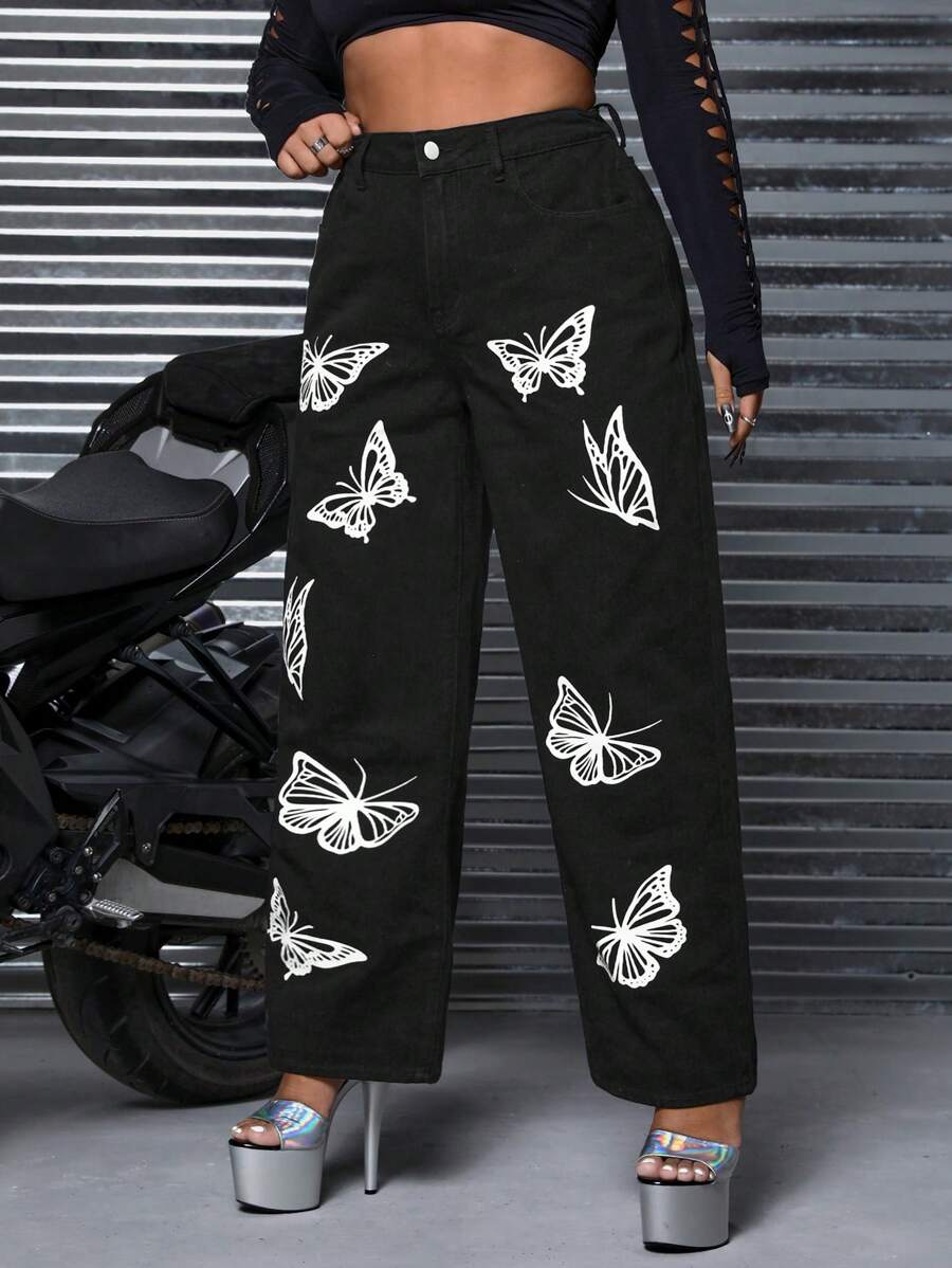 SHEIN ICON Plus Butterfly Print Straight Leg Jeans