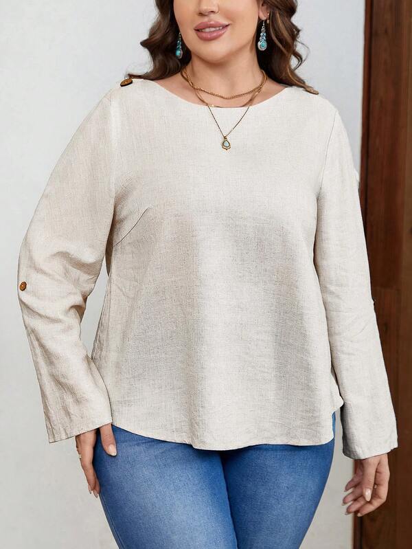 EMERY ROSE Plus Button Detail Roll Tab Sleeve Blouse
