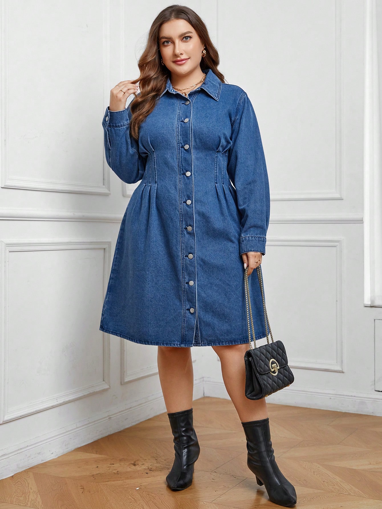 SHEIN Privé Plus Button Front Fold Pleated Detail Denim Dress