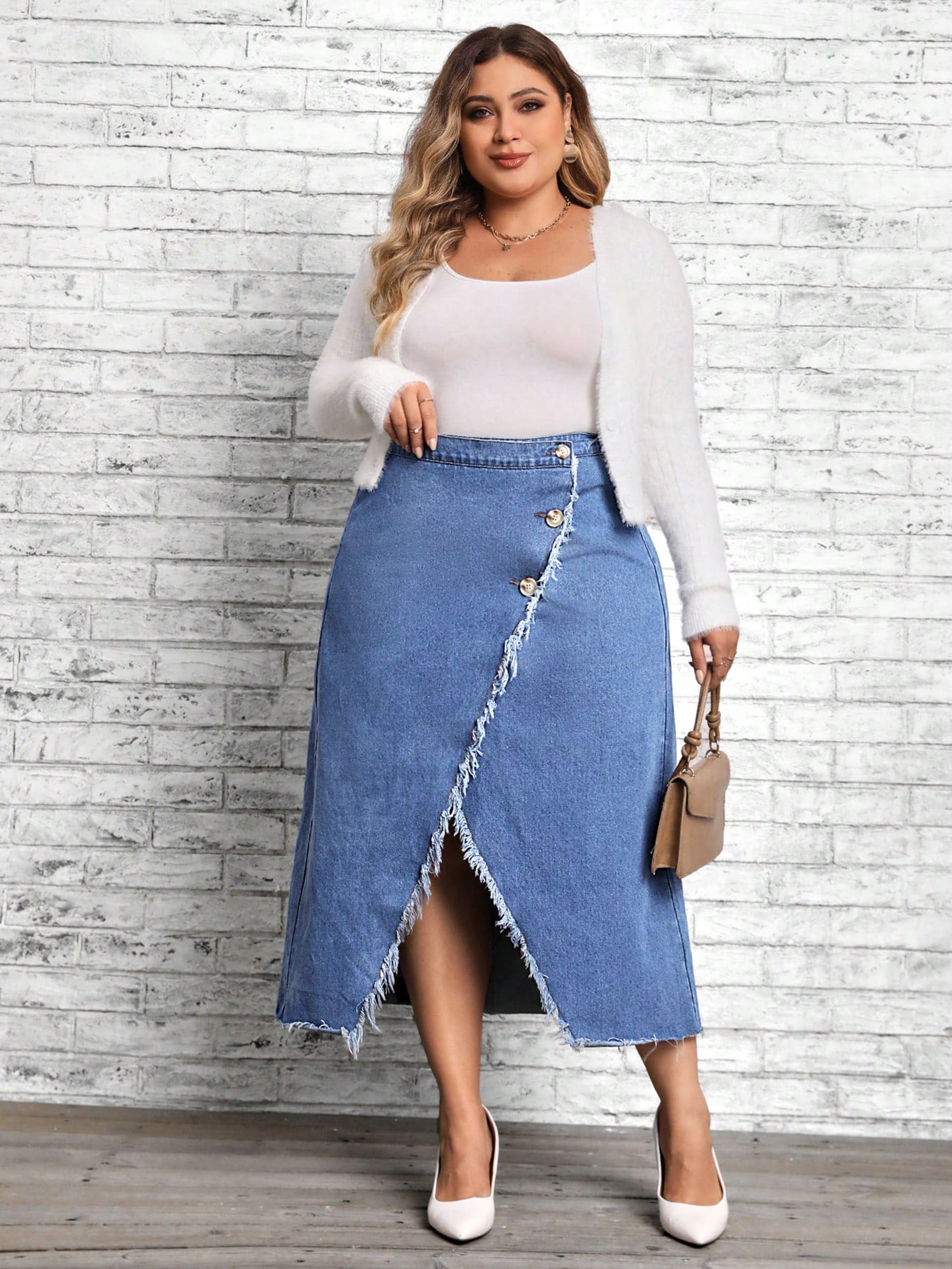 SHEIN LUNE Plus Button Front Raw Trim Wrap Hem Denim Skirt