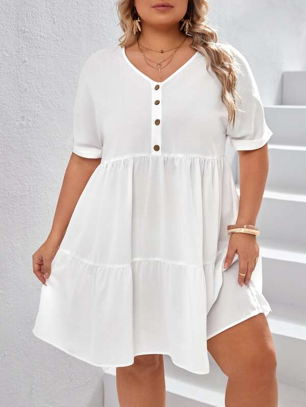 SHEIN VCAY Plus Button Front Ruffle Hem Dress