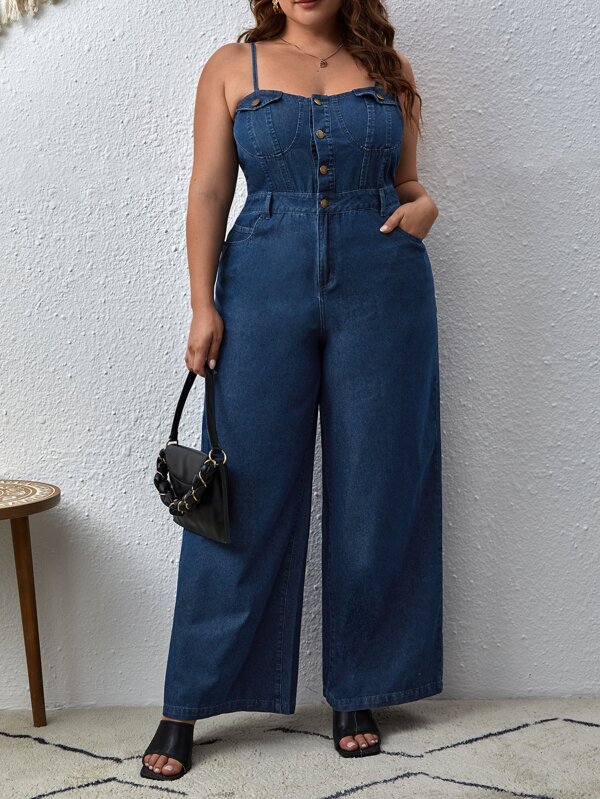 SHEIN Essnce Plus Button Front Wide Leg Denim Cami Jumpsuit