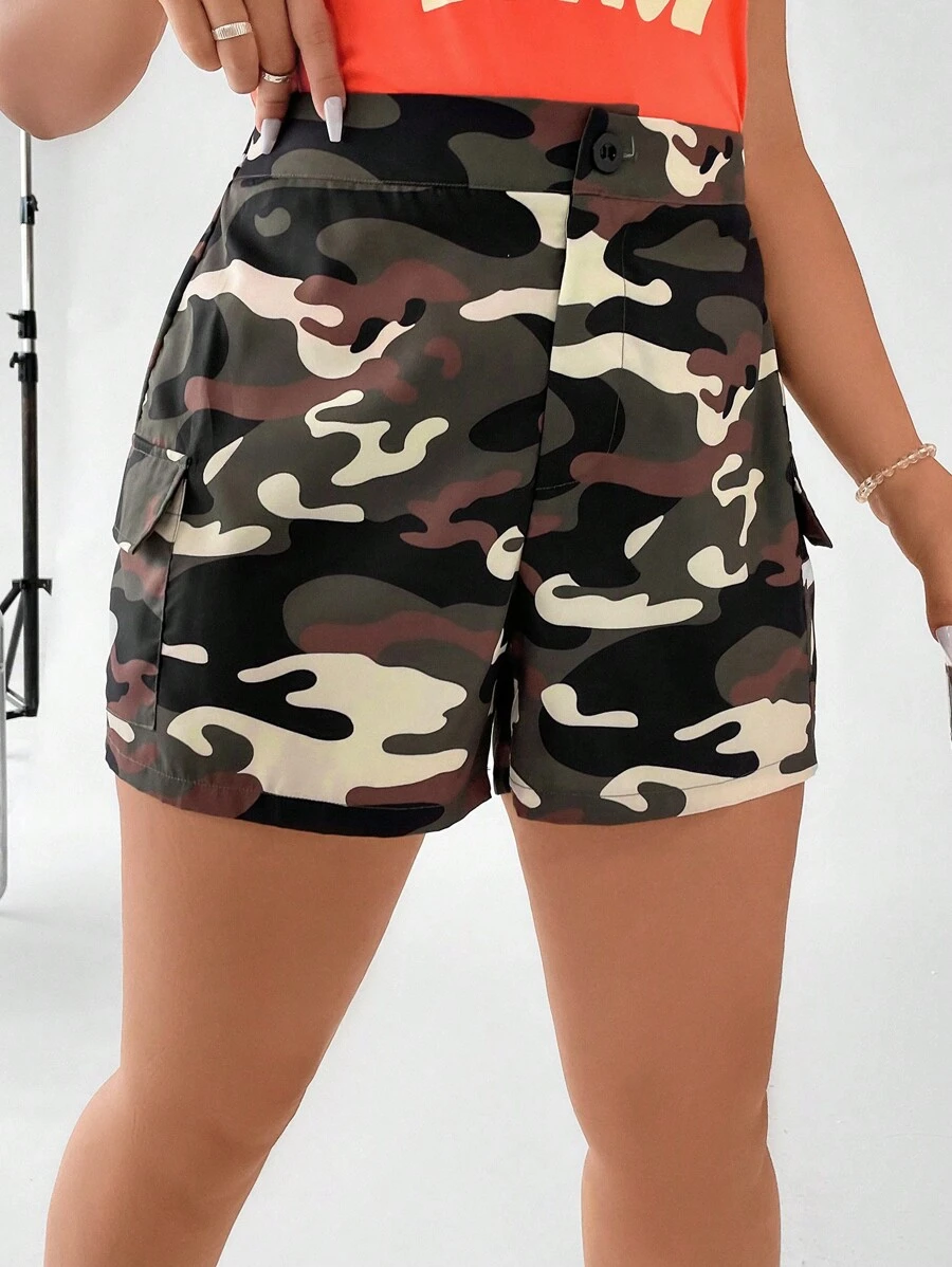 Plus Camo Print Flap Pocket Side Cargo Shorts