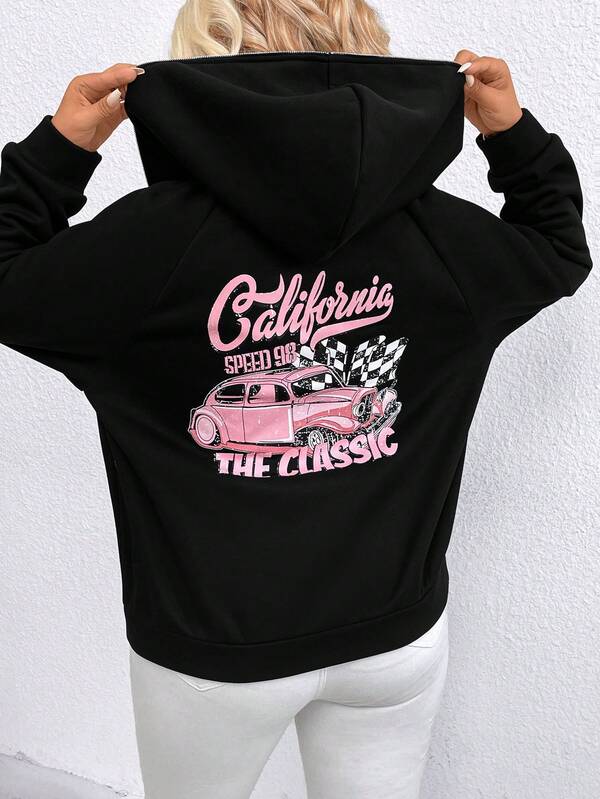 SHEIN Unity Plus Car & Letter Graphic Raglan Sleeve Zipper Up Hoodie