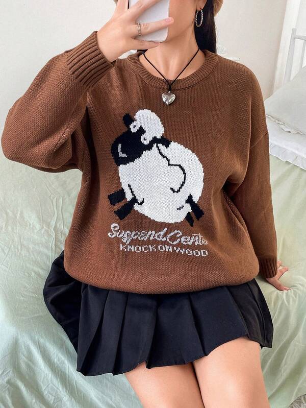 Plus Cartoon & Letter Pattern Drop Shoulder Sweater
