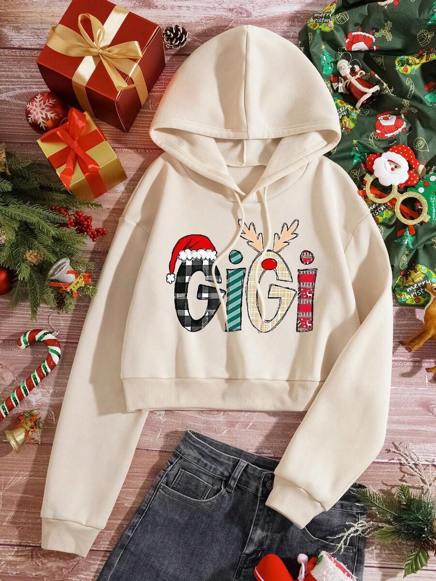 Plus Christmas Print Drop Shoulder Drawstring Thermal Lined Hoodie